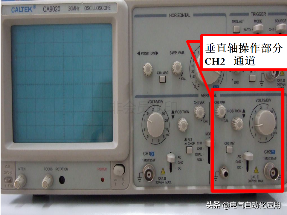 c、调整垂直灵敏度开关(V/div)于适当位置,垂直微调旋钮置“CAL”位置(顺时针到头)。