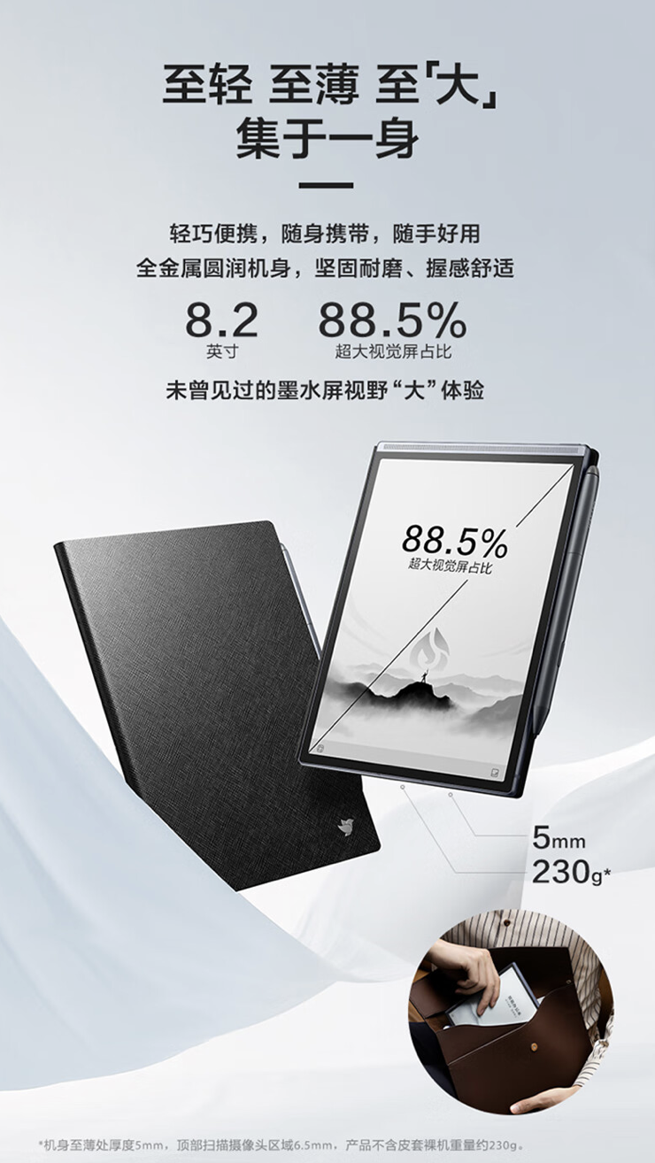据介绍,系列电纸书厚度 5 毫米,整体重量 230 克,配备 8.2 英寸 1920x1440 分辨率 E-Ink 墨水屏,支持 Wacom 电磁笔 4096 级压感书写;同时内置 5MP DocScan 扫描摄像头,能够智能扫描电子文件。