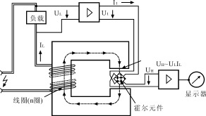使负载电压变换,令其与霍尔器件的工作电流成比例,将负载电流通入磁芯绕组中,作为霍尔电流传感器的被测电流,即可构成霍尔功率计。由霍尔器件输出的霍尔电压来指示功率,其工作原理如图49所示。