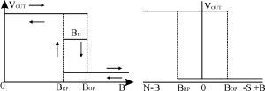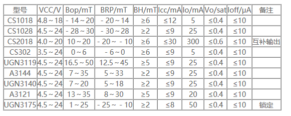 锁定型霍尔开关电路的特点是:当外加场B正向增加,达到BOP时,电路导通,之后无论B增加或减小,甚至将B除去,电路都保持导通态,只有达到负向的BRP时,才改变为截止态,因而称为锁定型。霍尔开关电路的性能参数见表4。