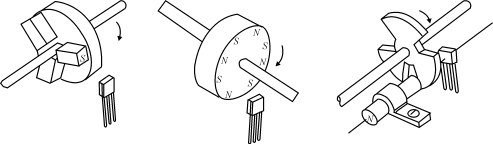 也可将工作磁体固定在霍尔器件背面(外壳上没打标志的一面),让被检的铁磁物体(例如钢齿轮)从它们近旁通过,检测出物体上的特殊标志(如齿、凸缘、缺口等),得出物体的运动参数。