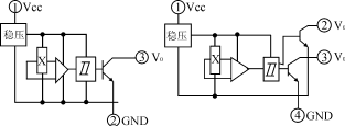 霍尔开关电路又称霍尔数字电路,由稳压器、霍尔片、差分放大器,斯密特触发器和输出级组成。在外磁场的作用下,当磁感应强度超过导通阈值BOP时,霍尔电路输出管导通,输出低电平。之后,B再增加,仍保持导通态。若外加磁场的B值降低到BRP时,输出管截止,输出高电平。我们称BOP为工作点,BRP为释放点,BOP-BRP=BH称为回差。回差的存在使开关电路的抗干扰能力增强。霍尔开关电路的功能框见图4。图4(a)表示集电极开路(OC)输出,(b)表示双输出。它们的输出特性见图5,图5(a)表示普通霍尔开关,(b)表示锁定型霍尔开关的输出特性。