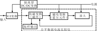 霍尔隔离放大器的原理框图示于图52,是以霍尔元件为中心,构成一个自平衡弱电流比较仪,用以取代变压器耦合隔离放大器中的调制、解调系统,使线路简化。仔细调整电流比较仪的电路,将放大器的频带大大展宽,使之可达DC~2MHz,而且保持了磁耦合隔离放大器的增益精度和光耦合隔离放大器的线性度,是一种高精度宽频带的隔离放大器。隔离放大器在空间技术、计算机技术、医疗和仪器仪表中有十分重要的应用。