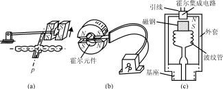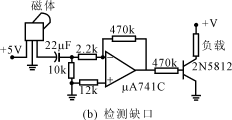 在霍尔线性电路背面偏置一个永磁体,如图11所示。图11(a)表示检测铁磁物体的缺口,图11(b)表示检测齿轮的齿。它们的电路接法见图12,(a)为检测齿轮,(b)为检测缺口。用这种方法可以检测齿轮的转速。
