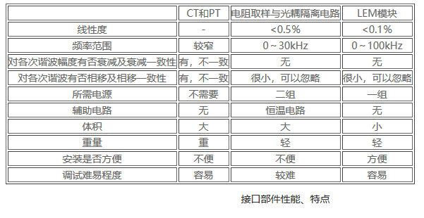 表8电力工频谐波分析仪中使用的3种接口部件的比较(LEM模块是一种霍尔零磁通电流传感器)