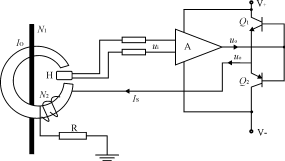 如图36所示,将霍尔器件的输出电压进行放大,再经电流放大后,让这个电流通过补偿线圈,并令补偿线圈产生的磁场和被测电流产生的磁场方向相反,若满足条件IoN1=IsN2,则磁芯中的磁通为0,这时下式成立: