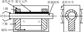 铁磁材料受到磁场激励时,因其导磁率高,磁阻小,磁力线都集中在材料内部。若材料均匀,磁力线分布也均匀。如果材料中有缺陷,如小孔、裂纹等,在缺陷处,磁力线会发生弯曲,使局部磁场发生畸变。用霍尔探头检出这种畸变,经过数据处理,可辨别出缺陷的位置,性质(孔或裂纹)和大小(如深度、宽度等),图16示出两种用于无损探伤的探头结构。(b)检测线材用