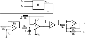 如图37所示,来自高压三相输电线路电流互感器的二次电流,经三只霍尔电流传感器H(图中只画出B相的一只),按比例转换成毫伏电压输出,然后再经运算放大器放大及有源滤波,得到符合要求的电压信号,送微机进行测量或处理。使用霍尔电流传感器很方便地实现了无畸变、无延时的信号转换。