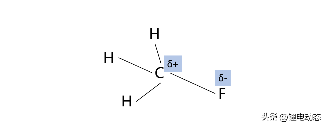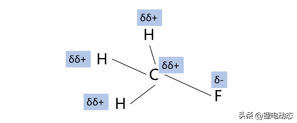 由于碳和氢的电负性差距非常小,两者对碳氢之间成键电子的作用力相当,使得成键电子几乎就保持在键中点,没有δ+也没有δ-。 但是这时由于碳氟之间的成健电子距离氟原子更近了,导致碳原子对外界电子多出来一部分吸引力,这部分吸引力就作用在了碳氢键的成键电子上,所以氢原子的电子被拉过来了,如下图。