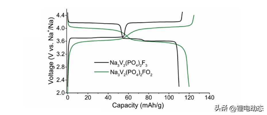 文献[2]中提到,随着O/F比增加(即氧含量的增加、氟含量的减少),诱导效应减弱,材料的充放电电压降低,Na3(VOPO4)2F和Na3(VPO4)2F3两者电压差约为100 mV,如下图。