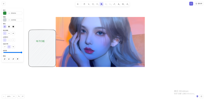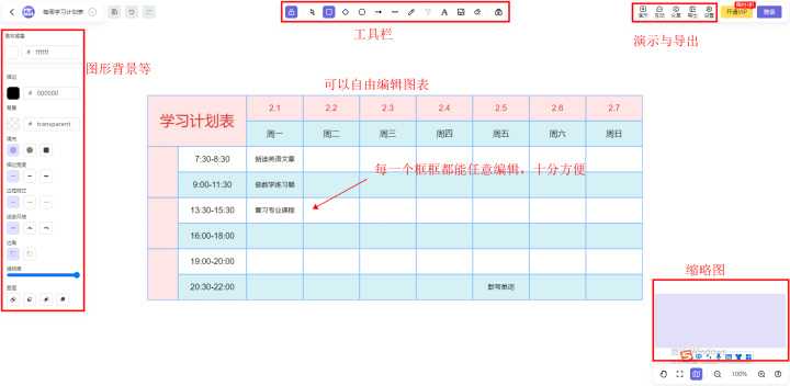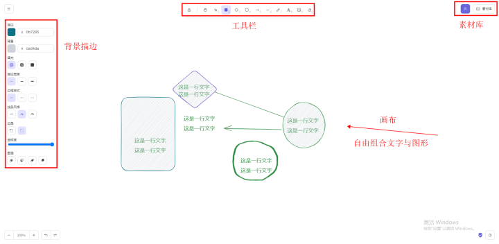 基础工具内容都是有的,包括拥有很多形状和画笔等的工具栏,素材库,背景描边,以及无限制的超大白板~