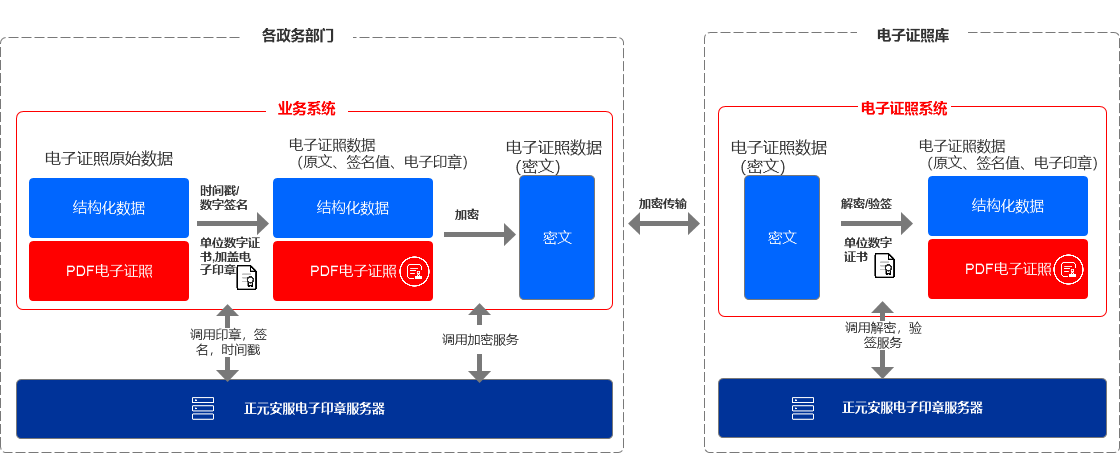 2019年1月1日起,国家市场监督管理总局、国家标准委、国家电子文件管理部际联席会议办公室(国家密码管理局)联合发布的六项电子证照国家标准正式实施:包括《电子证照 总体技术架构》、《电子证照 目录信息规范》、《电子证照 元数据规范》、《电子证照 标识规范》、《电子证照 文件技术要求》、《电子证照 共享服务接口规范》等。这一系列标准规定了电子证照应用的总体技术框架、统一的证照分类规则和证照基础信息,为每个电子证照赋予了“身份证号”。在电子证照的广泛应用中,需要确保电子证照来源真实可信、确保电子证照数据机密性与完整性、确保电子证照的不可篡改、确保电子证照签发时间的权威可靠,提高电子证照的法律效力。