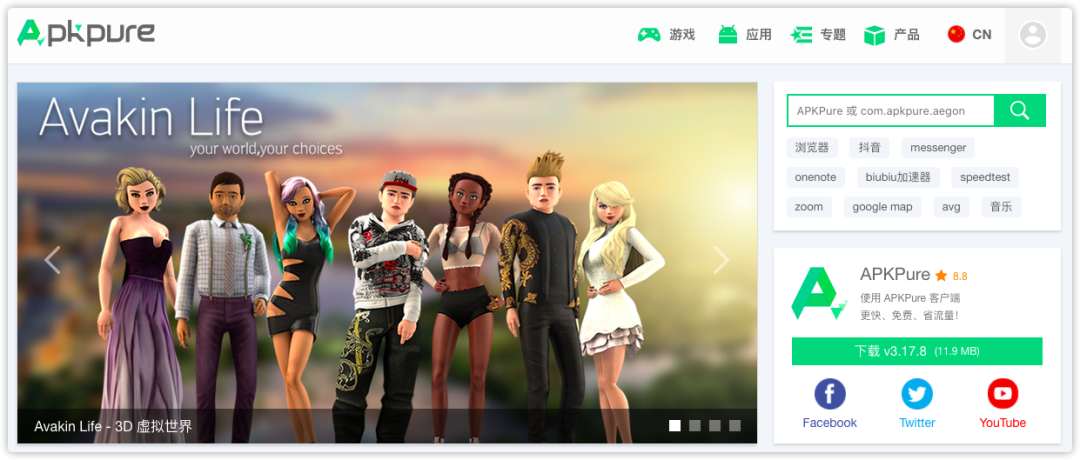 APKpure拥有网页版和安卓客户端,支持中文,曾有一段时间这个网站在国内超级火,目前网站无法在国内访问,完全可替代谷歌官方商店。