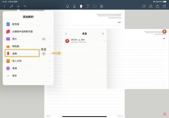 《Noteshelf》也支持录音功能,点击添加→音频就可以录制内容了,笔记的右上角会出现录音小按钮,不过它只能单纯录制不能实时跟踪笔迹,录音是单独储存的,首页中不能直观表现出哪个笔记中有录音文件,这一点没有《Notability》方便易用。