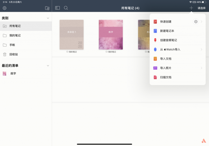 点击右上角「+」创建新的笔记本,支持导入的格式很多;