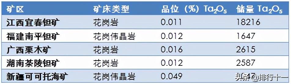 中国钽矿资源分布在13个省区,依次为:江西占25.8%,内蒙古占24.2%,广东占22.6%,三省合计占72.6%,其次湖南占8.6%,广西占5.9%,四川占5.3%,福建占5.1%,湖北占1.2%,五省合计占26.1%,以及新疆、河南、辽宁、黑龙江、山东等5省区合计占1.3%。砂矿储量:钽铁矿矿物主要分布在广东,细晶石矿物分布在湖南和广东,前者占55.5%,后者占44.4%。注:以上数据统计不包括2015年,江西有色地质勘查局矿勘院详查的横峰县葛源矿区铌钽矿床和2014年1月,陕西省地质调查院发现的陕西东南部发现特大型铌钽矿和铷矿。请注意区分。中国钽矿区【全球钽矿产量】