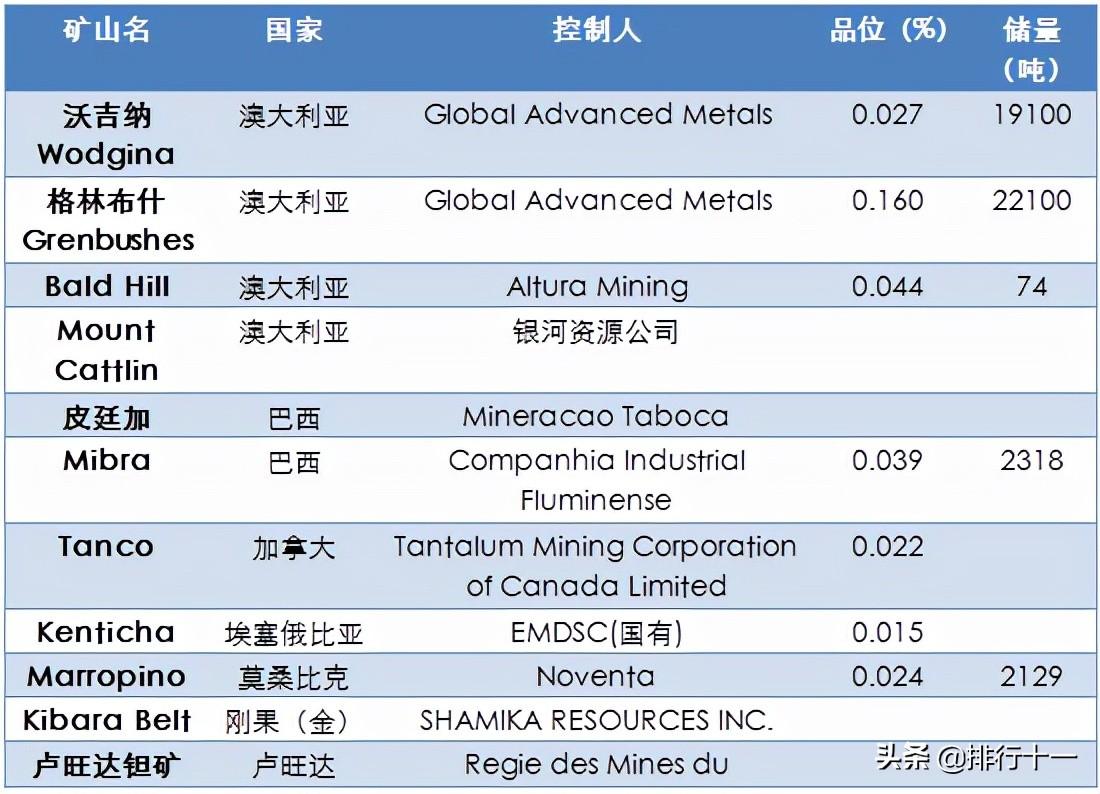 钽是稀有金属,在地壳中的含量为0.0002%,在自然界中常与铌共存。含钽矿物很多,但作为钽矿物(Ta/Nb≥ 1)的却不多,具有工业价值的钽的主要矿物有:钽铁矿[(Fe,Mn)(Ta,Nb)2O6]、重钽铁矿(FeTa2O6)、细晶石[(Na,Ca)Ta2O6(O,OH,F)]和黑稀金矿[(Y,Ca,Ce,U,Th)(Nb,Ta,Ti)2O6]等。【世界钽资源储量分布情况】