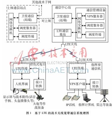通信中心站一般搭载于专用的通信车上,通过LTE通信基站提供无线通信信号的覆盖,完成数据和话音的双向传输。通信中心站的通信管理设备包括网络交换机、VPN服务器、调度服务器和调度终端。可通过网络交换机接入本地卫星通信设备,实现本系统与上级通信站点的图1基于LTE的战术无线宽带通信系统理图实时通信。