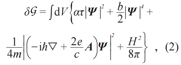 既然超导态是一个新的物相,那它也可以用序参量来描写吗?由于当时超导的机理并不清楚,超导序参量的选取是个很大的挑战。金兹堡(Ginzburg)和朗道根据超导体对磁场有响应的实验事实,推断出超导序参量应该取复值,从而具有相位自由度。这样才可以和磁矢势以最小耦合(minimal coupling)的方式结合,也就是说超导序参量是带电的,其有效电荷称作*。可以推断出*必须是一个常数,否则*和磁矢势()的乘积会破坏电磁规范对称性。既然序参量是复函数,那它就和量子力学波函数类似,所以不妨把序参量的模平方解释成超流电子的密度,这样就构造出了著名的超导态的金兹堡—朗道自由能,如下式所示,