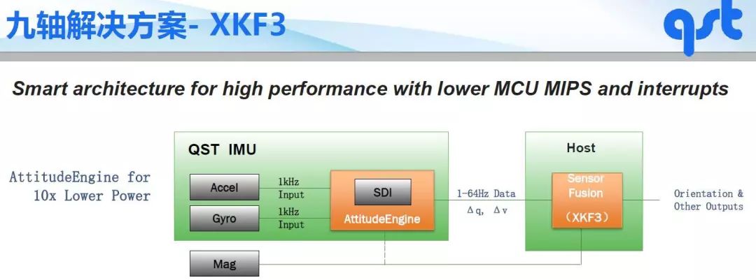 基于卡尔曼滤波的XKF3 传感器融合算法,可融合地磁数据形成9轴方案,具有高精度、实时、低延时的特点,以及超低的系统功耗。