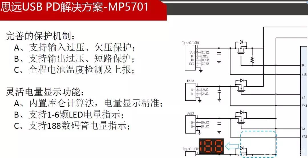 MP5701思远推出的USB PD解决方案,同步开关升压系统可提供最大100W(20V/5A)输出能力,电池电压全程输出100W仍能保持90%以上的效率。MP5701同步开关充电系统,提供高达5.0A充电电流。内置IC温度、电池温度和自适应适配器功能,智能调节充电电流。充电和放电都支持快充。