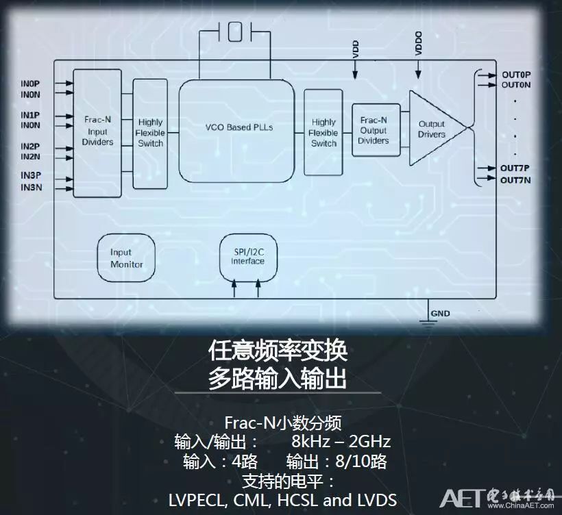 INS8320具有超低抖动、超低环路带宽、任意频率转换、多路输入输出的特点,其中在输出抖动及环路带宽等指标上达到世界先进水平,满足了在各种应用领域中的高速接口时钟及系统参考时钟的应用需求。