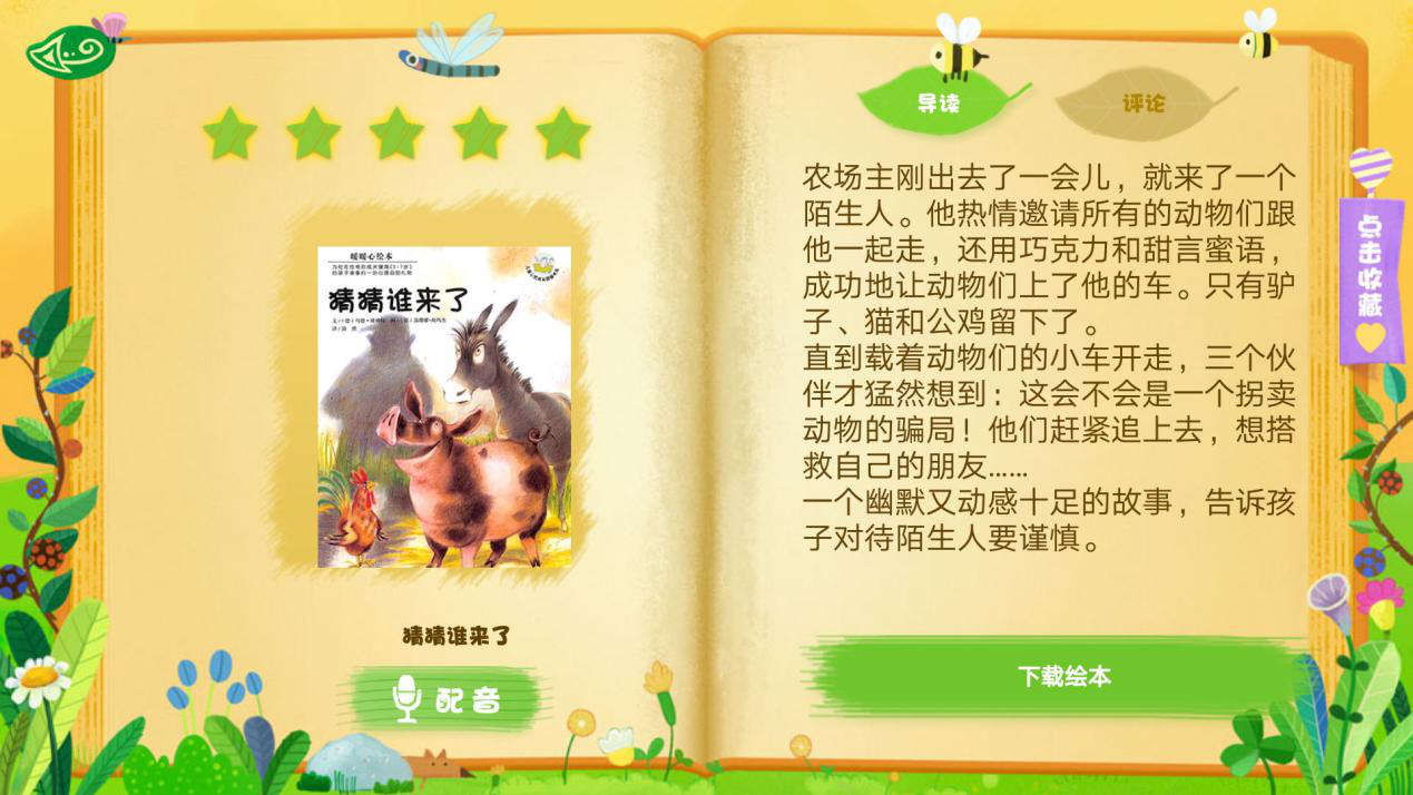 绘本森林的主要板块是绘本阅读和绘本圈两块。绘本部分主要有中文绘本、英文绘本和原创绘本三部分。点开绘本后,在页面上有绘本封面、导读、评论等,用户可以自己选择是否要下载绘本,以及是否下载绘本配音。开始阅读后,可以选择自动播放和手动播放。