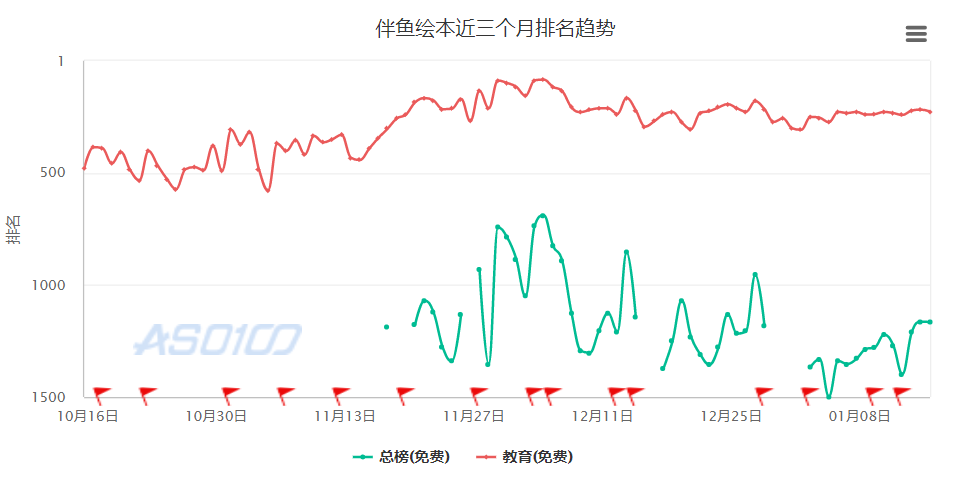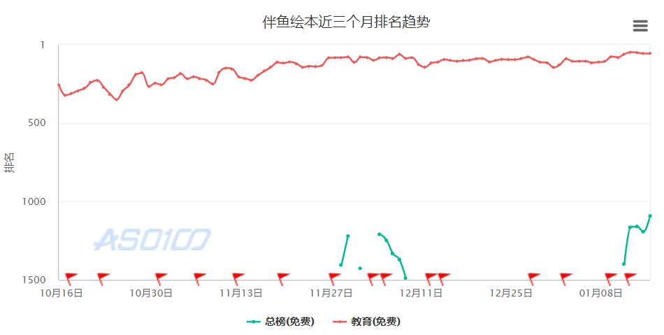 2018年1月16日当日,伴鱼绘本在iPhone教育免费榜中排行57,在总榜免费排行1094;在iPad教育免费榜中排行227,总榜免费榜排行1163。