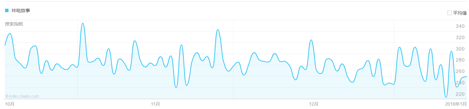 搜索关键词“咔哒故事”,显示搜索指数趋势如下。近三个月来,咔哒故事的日均搜索值在260左右,并且在周末也有搜索谷底情况出现。