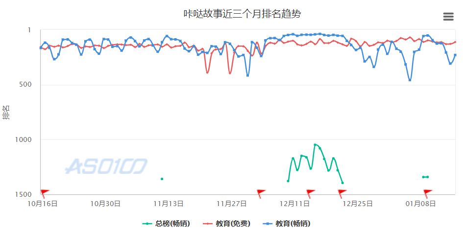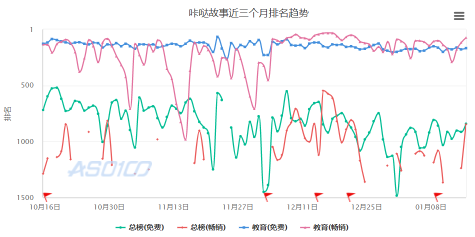 从数据中可以看出,咔哒故事在iPhone端的排名近三个月以来稳定在前500,进入总榜的次数较少。IPad端的排名趋势相比iPhone端波动较大,但基本可保持进入总榜排名。