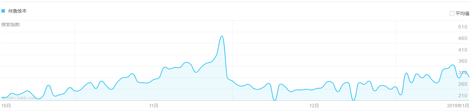 下图为近三个月来伴鱼绘本的搜索指数,峰值与谷期的时间间隔有一定规律性,但日期也不与工作日/周末十分相关,近三个月来的最高峰值出现在2017年11月29日,当日是星期三,而一些谷期也出现在了周六、周日。整体日均搜索指数在200以上。