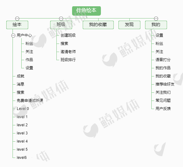 伴鱼的主要功能可分为阅读与录制两部分。绘本有level 0—level 6七个进阶,每个进阶的绘本都可以进行收听和录制。收听与录制是分页的形式,绘本名称、插图、文字都会显示在页面上。用户可以等待一页播放结束后自动翻页,也可以手动翻页。