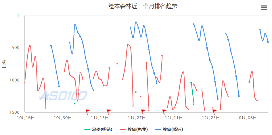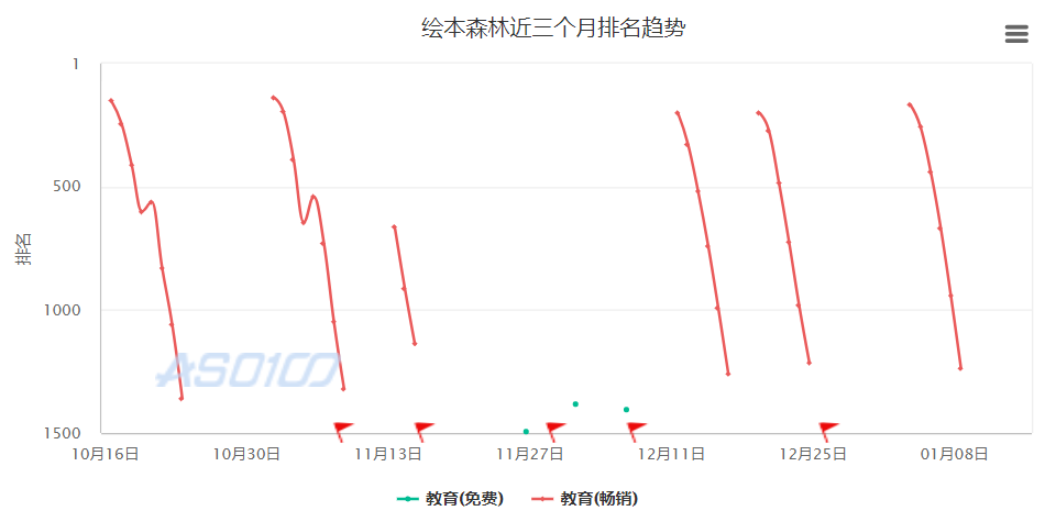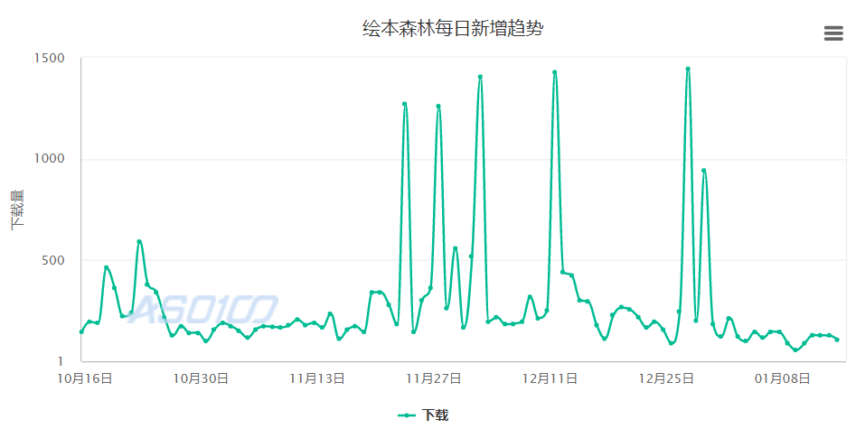 据ASO100显示,2017年10月16日-2018年1月15日,绘本森林在iOS市场下载量估算为355,而且多日出现下载量为0的情况,我们猜测也许绘本森林主打的是Android市场?