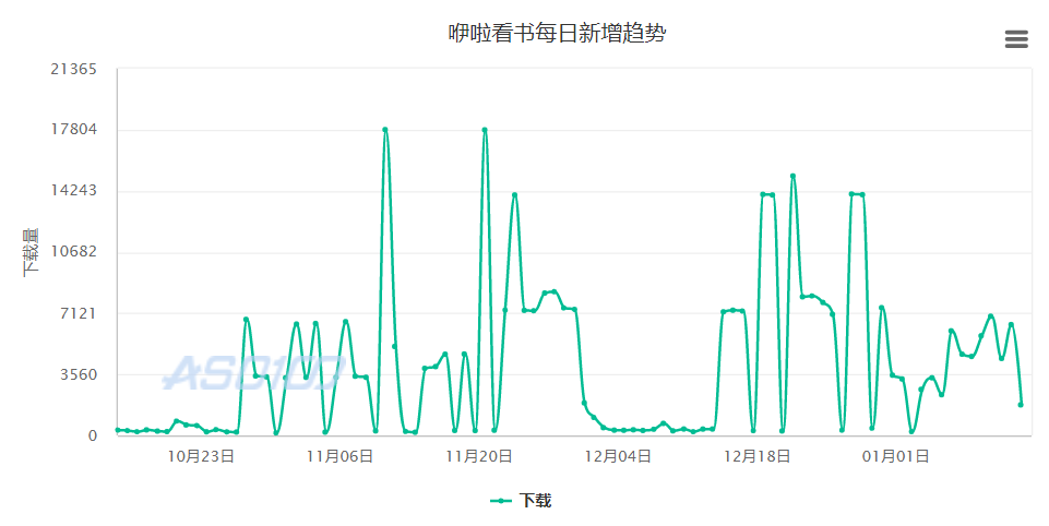近三个月来,咿啦看书每日新增下载量总体波动较大,最高时下载量可达17800以上。但最高峰的几个日期,有周二、周五,也有周六、周日,与工作日/周末无明显的相关关系。