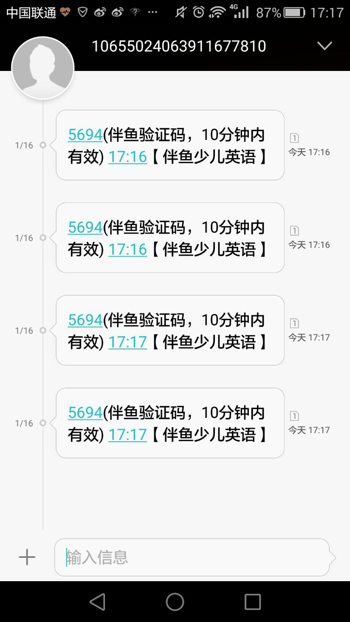 在用手机号注册伴鱼绘本APP时,我们发现,同一手机号的密码并不是动态密码,在一段时间内密码都是一样的,且发送方显示为“伴鱼少儿英语”。