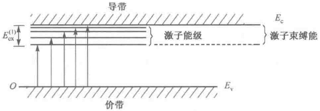 2 激子吸收:半导体中的电子和空穴之间由于库仑力作用有可能形成类似于氢原子模型中的电子束缚态,这种电子和空穴形成的束缚态称为激子。激子吸收的物理本质为价带电子吸收光子后直接跃迁到导带下面的激子能级所引起的光吸收,如图2所示。激子不仅在吸收边外吸收光子,而且还会使带间跃迁吸收谱的在低于光子能量的一侧出现若干激子吸收峰。