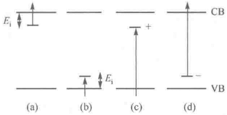 4 杂质吸收:在适当能量的光子作用下,杂质能级所束缚的电子和空穴也可以产生光跃迁,如图4所示:(a)中性(即未电离的)施主杂质与导带之间的跃迁;(b)价带与中性受主杂质之间的跃迁;(c)价带与中性施主杂质之间的跃迁;(d)中性受主杂质与导带之间的跃迁。与激子吸收不同,激子吸收是发生在分立能级与完全确定的主能带之间,而杂质吸收是杂质能级与整个能带之间的跃迁。