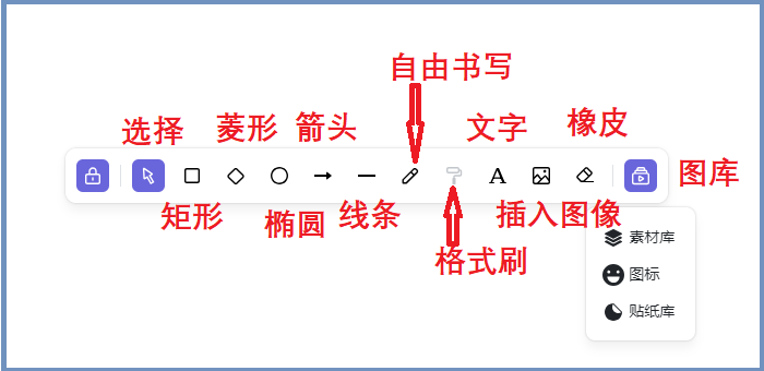 Excalidraw支持最常用的图形元素:方框、圆、菱形、连接线,可以方便的使用这些元素绘制简洁的图形。