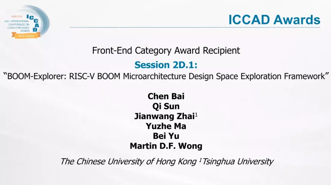 2021年ICCAD Front-End最佳论文奖授予了《BOOM-Explorer: RISC-V BOOM Microarchitecture Design Space Exploration Framework》,第一作者是就读于香港中文大学计算机科学与工程系的博士生白晨,导师为余备教授和黄定发教授。