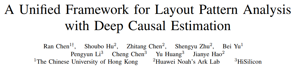 清华大学喻文健教授团队提出将区域分解与谱图稀疏化结合的方法,包括并行的谱图稀疏化、以及使用区域分解法对由稀疏子图得到预条件子进行并行求解的技术,它继承了谱图稀疏化带来的良好迭代收敛性,同时实现高效率并行计算。在一台 16 核 CPU、512GB 内存机器上的实验表明,该方法相比串行的谱图稀疏化迭代解法有 5.5 倍的平均加速,相比前人的并行供电网络仿真算法有 5.2 倍的平均加速。对一个实际的含 3.6 亿节点、42 亿条边的供电网络,它的求解用时仅为 23 分钟,比串行算法快 9.5 倍。这是首次报道在一台普通的 16 核计算机上仅用不到半小时的时间求解如此大规模的供电网络。Paper D: A Unified Framework for Layout Pattern Analysis with Deep Causal Estimation