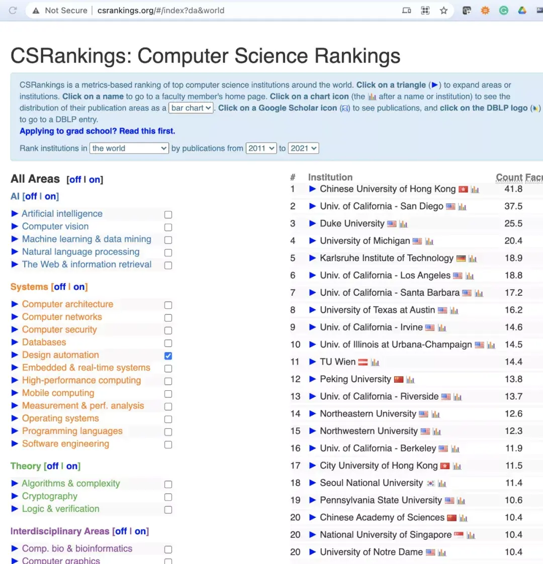 在EDA(design automation)领域,港中文、UCSD和杜克大学位列世界排名前三。大部分上榜高校都是欧美名校,在表现比较好的亚洲高校中,港中文排名第一位,北大排名12,香港城市大学第排名17,中科院和新加坡国立大学并列20。
