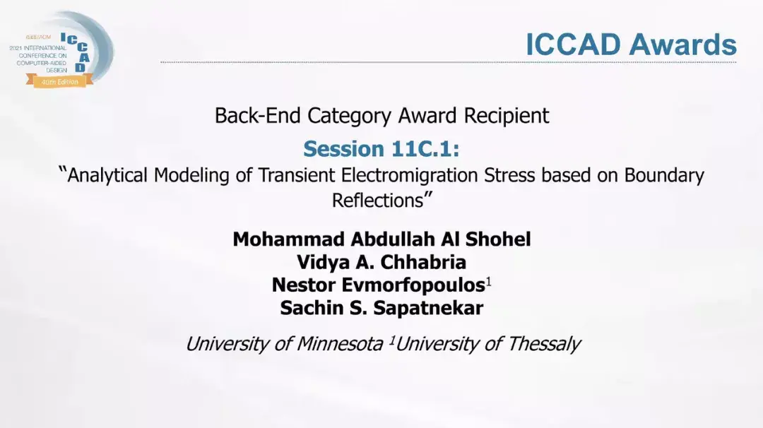 从左至右:白晨、余备教授、黄定发教授。本次的Back-End最佳论文奖授予了《Analytical Modeling of Transient Electromigration Stree based on Boundary Reflections》,第一作者是来自明尼苏达大学的 Mohammad Abdullah Al Shohel。