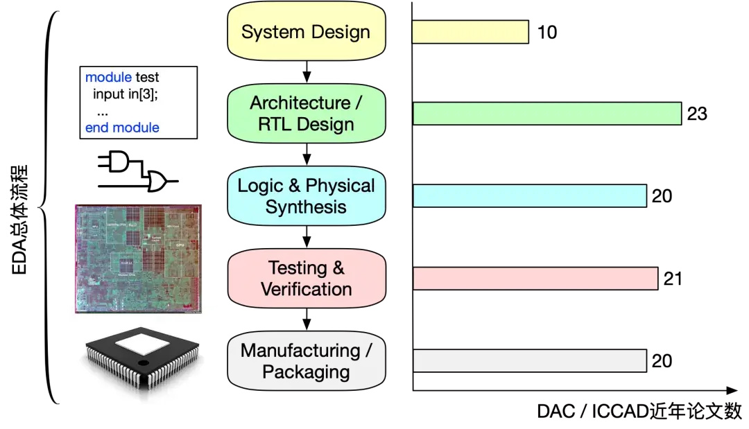 香港中文大学 EDA 团队目前共有教授 7 人,其中IEEE院士、ACM院士 1 人(港中大工程学院院长黄定发教授),ACM杰出科学家 2 人(杨凤如教授,何宗易教授)。团队研究范围全栈式覆盖了系统设计、架构设计、逻辑物理综合、测试与验证、制造与封装等EDA领域。近六年来,团队在 EDA 领域国际顶级会议 DAC&ICCAD 共计发表论文 94 篇(系统设计 10 篇、架构设计 23 篇、逻辑物理综合 20 篇、测试与验证 21 篇、制造与封装 20 篇),位居世界前列。