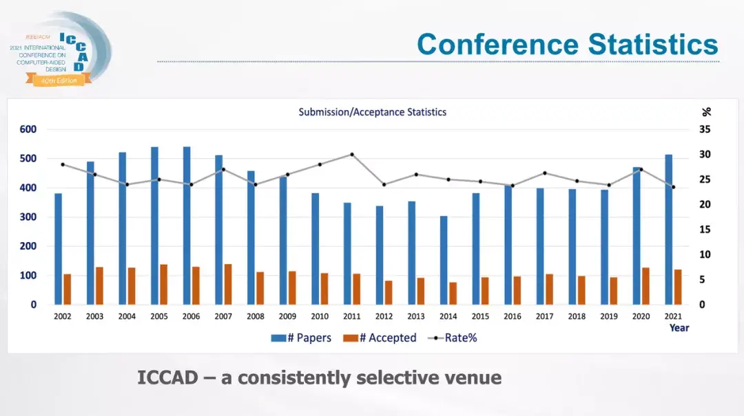 由于疫情原因,今年的 ICCAD 依然采用线上会议的方式举办,会议从 11月1日 至 4日 共四天。ICCAD 2021 收到了全球范围内的 514 篇投稿,最终 121 篇论文被收录(23.5%的录取率),竞争十分激烈。