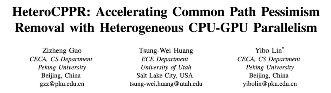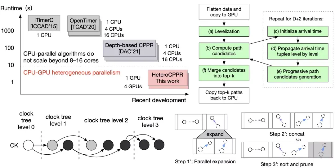 在该框架的第一阶段,使用一个使用对比学习训练的编码器网络来提取布局片段的表示,这些布局片段对移位、旋转和镜像等转换是等价的,然后将其聚类形成布局模式。在第二阶段,该框架通过一个结构因果模型建立任何潜在的根本原因布局模式和系统缺陷之间的因果关系模型,然后使用该模型估计候选布局模式对系统缺陷的平均因果效应(ACE),以识别真正的根本原因。在实际工业设计中的实验结果表明,此框架在精度和速度上都优于商业工具。Paper E: HeteroCPPR: Accelerating Common Path Pessimism Removal with Heterogeneous CPU-GPU Parallelism