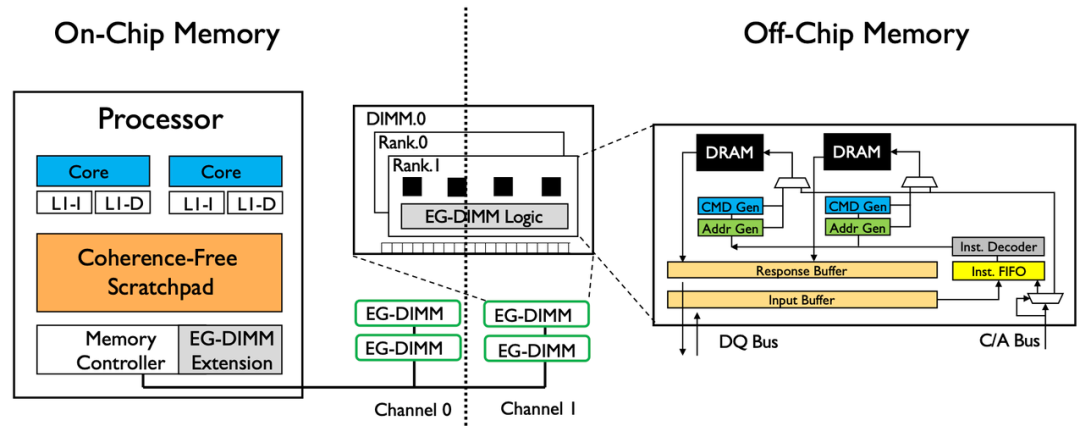 为此,UCSB 谢源教授团队设计了专用于图的内存架构:G-MEM。一方面,其使用了scratchpad替代缓存,并相应的提出了针对图结构中“热点”数据的管理算法,在与缓存相同大小的情况下提升了约 10% 的命中率。另一方面,其重新设计了 DRAM 的通道架构,并使用了多个独立控制器以支持细粒度的访存。相比于传统处理器,G-MEM 在多个图任务下提升了 2.6 倍的性能。