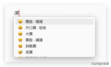 在编辑笔记时,使用西文的冒号 :,并紧跟着输入一些中文关键词,应用就会识别出匹配的 Emoji 图标并提供候选框,我们可以利用上下方向键来挑选,按下回车就能直接输入。
