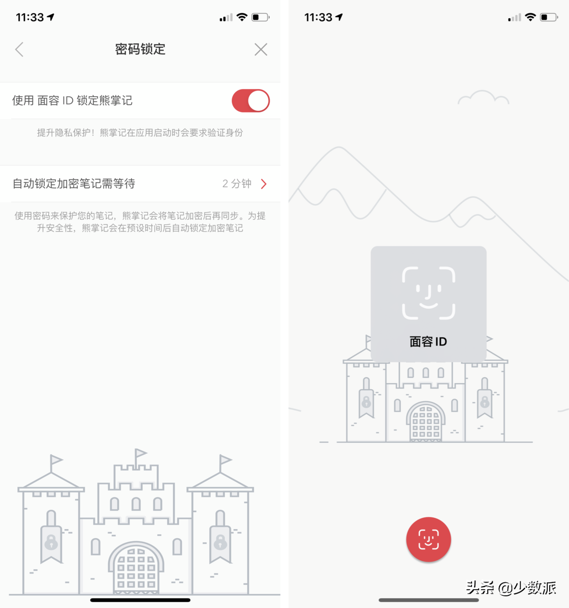 在 iOS 和 iPadOS 版熊掌记中,进入应用的 设置 - 密码锁定 中开启,那么每次熊掌记进入后台后重新打开,都需要使用面容 ID 或指纹 ID 验证身份后才能打开应用。注意,在 iOS 上该功能不支持使用密码锁定。在 macOS 版中则是进入 偏好设置 - 通用 中开启。