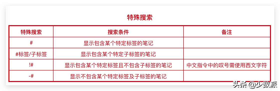 特殊搜索新增了三条关于搜索标签的指令,用于搜索含特定标签的笔记,甚至是标签的子标签:#、!#、-#。需要注意的是,利用特殊搜索搜索标签时,必须打全标签,如果我们想要进行标签的模糊搜索,那么在搜索框中直接输入标签即可,不需要用#。