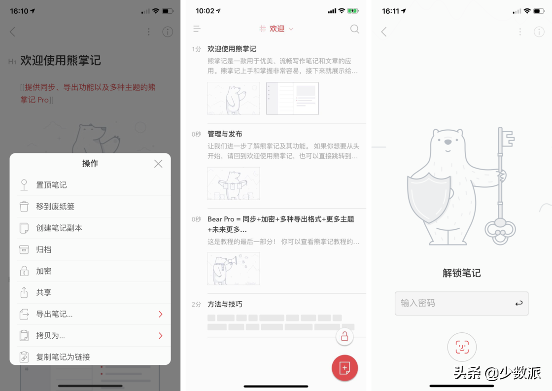在 v1.7 中,我们可以对单篇笔记进行加密锁定设置,该功能支持 iOS、iPadOS 和 macOS,也支持面容 ID 和指纹 ID。需要注意的是,笔记锁定功能需要订阅 Bear Pro 才可以使用。
